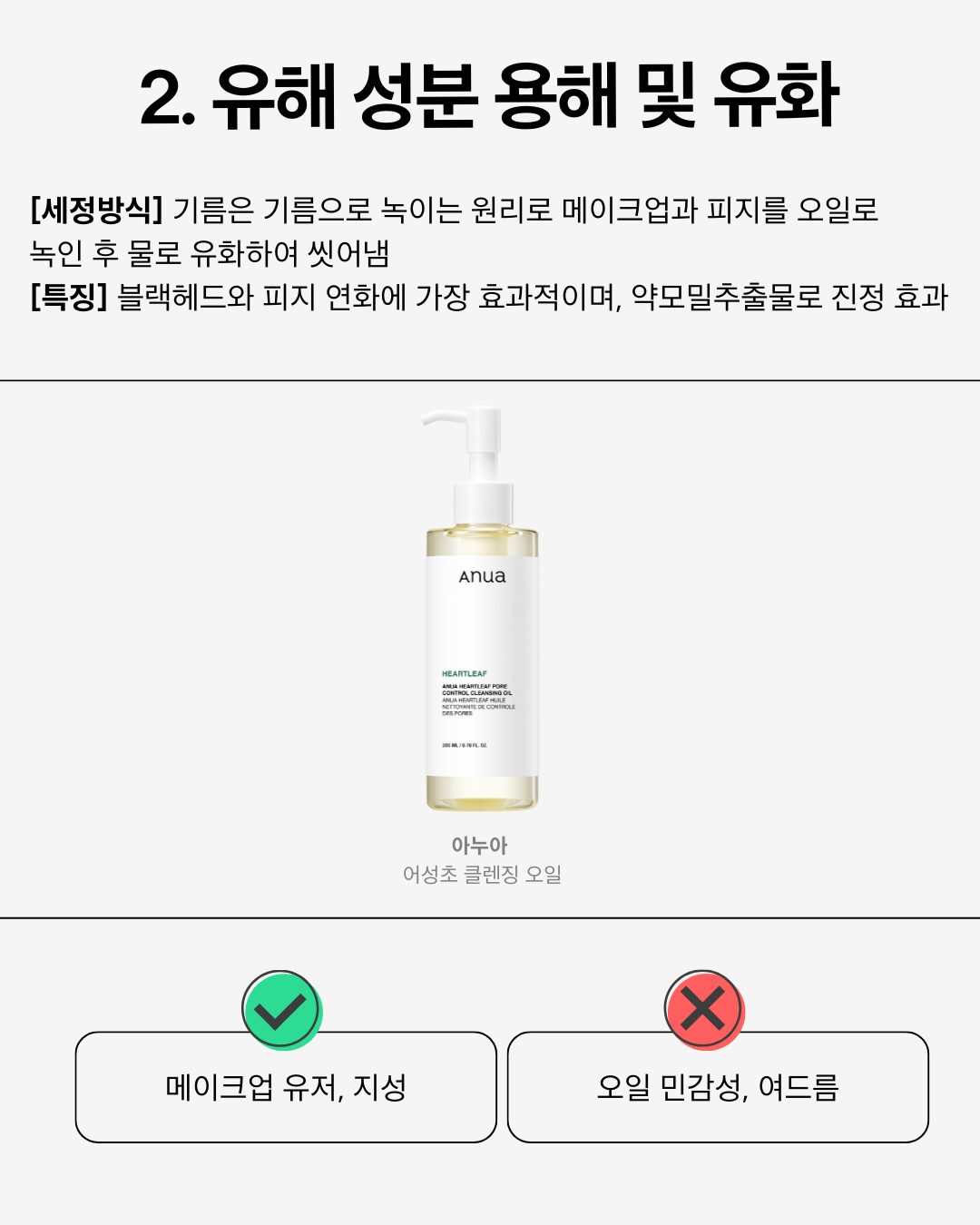 | 5 | 아누아 어성초 클렌징 오일 | 피지/블랙헤드 녹여내는 오일 | 친유성 오일 유화 |