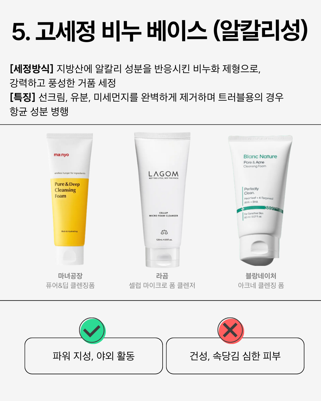 | ⑤ 고세정 비누 베이스 | 파워 지성, 야외 활동 | 건성, 속당김 심한 피부 | 미세먼지와 강력한 유분을 완벽히 제거. 딥클렌징 효과는 좋으나 과도한 수분 탈취를 막기 위해 세안 직후 보습 필수 |