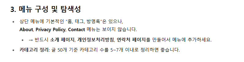 그러면 이렇게 쭉 체크리스트를 알려주는데 이게 생각보다 많이 맞더라구요! 여러 블로그에서 본 글들이라 제가 챙긴 것들도 있었지만 놓친 것들도 있었는데요, 저의 경우에는 메뉴 구성에 대한 부분을 누락하였습니다. 소개, 개인정보처리방침, 연락처에 대한 페이지는 별도로 만든 적이 없었기 때문에 이 부분을 보완했습니다. 이 페이지들을 추가할 때도 어떤 내용을 넣으면 되는지 예시를 다 알려주니 얼마나 좋게요!